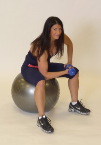 Sit on a stability ball holding a dumbbell in right hand. Lean forward, placing right elbow on inside of right thing, arm extended with thumb up. Slowly curl weight toward shoulder, rotating hand so palm faces up. Hold for one counts, then slowly lower back to start. Complete set on right side; repeat on left side.